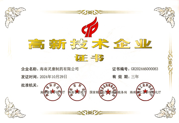 2024年國(guó)家高新技術(shù)企業(yè)認(rèn)定由海南省科學(xué)技術(shù)廳、海南省財(cái)政廳、國(guó)家稅務(wù)總局海南稅務(wù)局、海南省工業(yè)和信息化廳綜合評(píng)定、聯(lián)合審評(píng)。評(píng)審認(rèn)定工作重點(diǎn)圍繞3年來公司的科技立項(xiàng)、成果轉(zhuǎn)化、高新技術(shù)產(chǎn)品收入、知識(shí)產(chǎn)權(quán)情況、營(yíng)業(yè)收入、研究開發(fā)費(fèi)用以及研究開發(fā)人員等相關(guān)情況進(jìn)行梳理評(píng)審,每次認(rèn)定有效期為三年。截止目前,海南靈康制藥有限公司已連續(xù)5次通過該認(rèn)定。